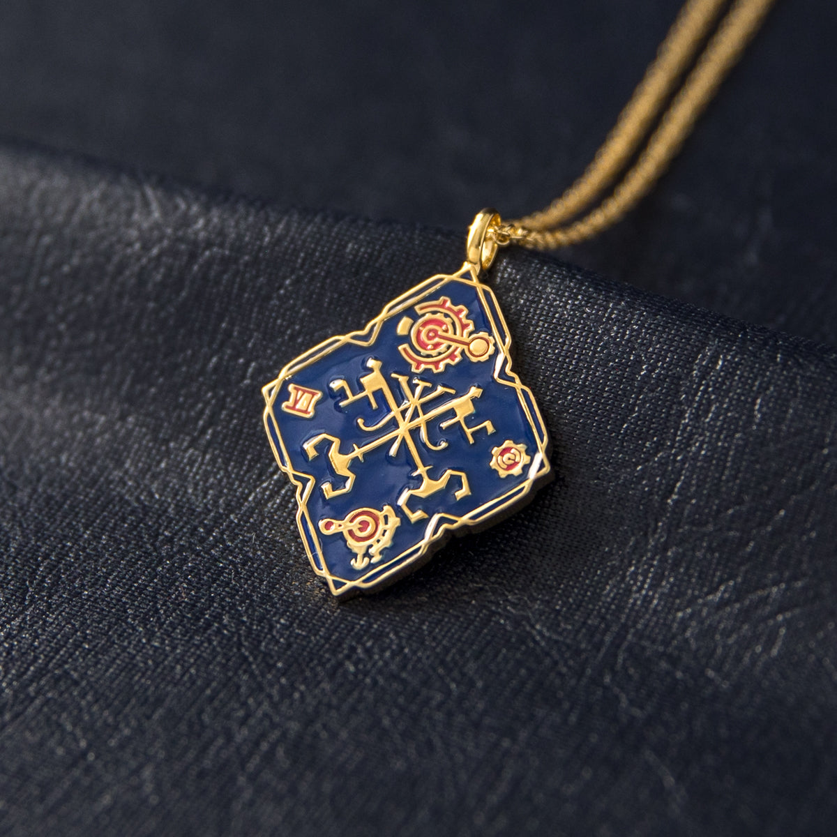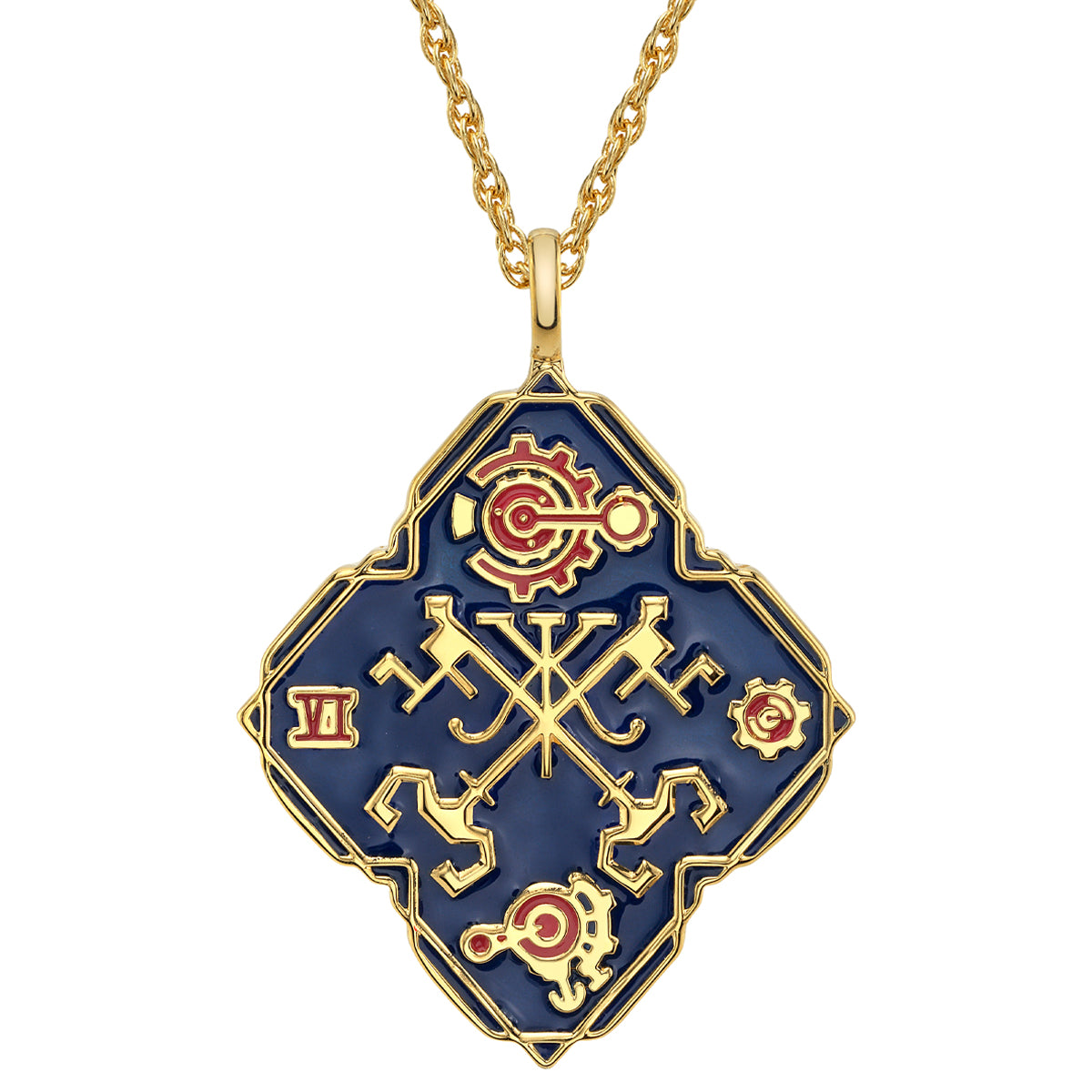 Handcrafted in nickel-free artisan brass and plated in a thick layer of warm 14K yellow gold, the Mad World Necklace immortalizes Caitlyn and Vi’s bond in exquisite detail. The diamond shaped pendant features a Piltover inspired frame encircling Caitlyn Kiramman’s family crest – two crossed keys sculpted in polished gold – symbolizing faith and protection. At each corner, raised sculpted details pay tribute to Vi: her iconic “VI” face marking and the stylized tattoo motifs seen along her neck and back. The background gleams in Caitlyn’s signature deep cobalt blue, contrasted by Vi’s vibrant magenta accents, each section meticulously hand-painted in enamel.