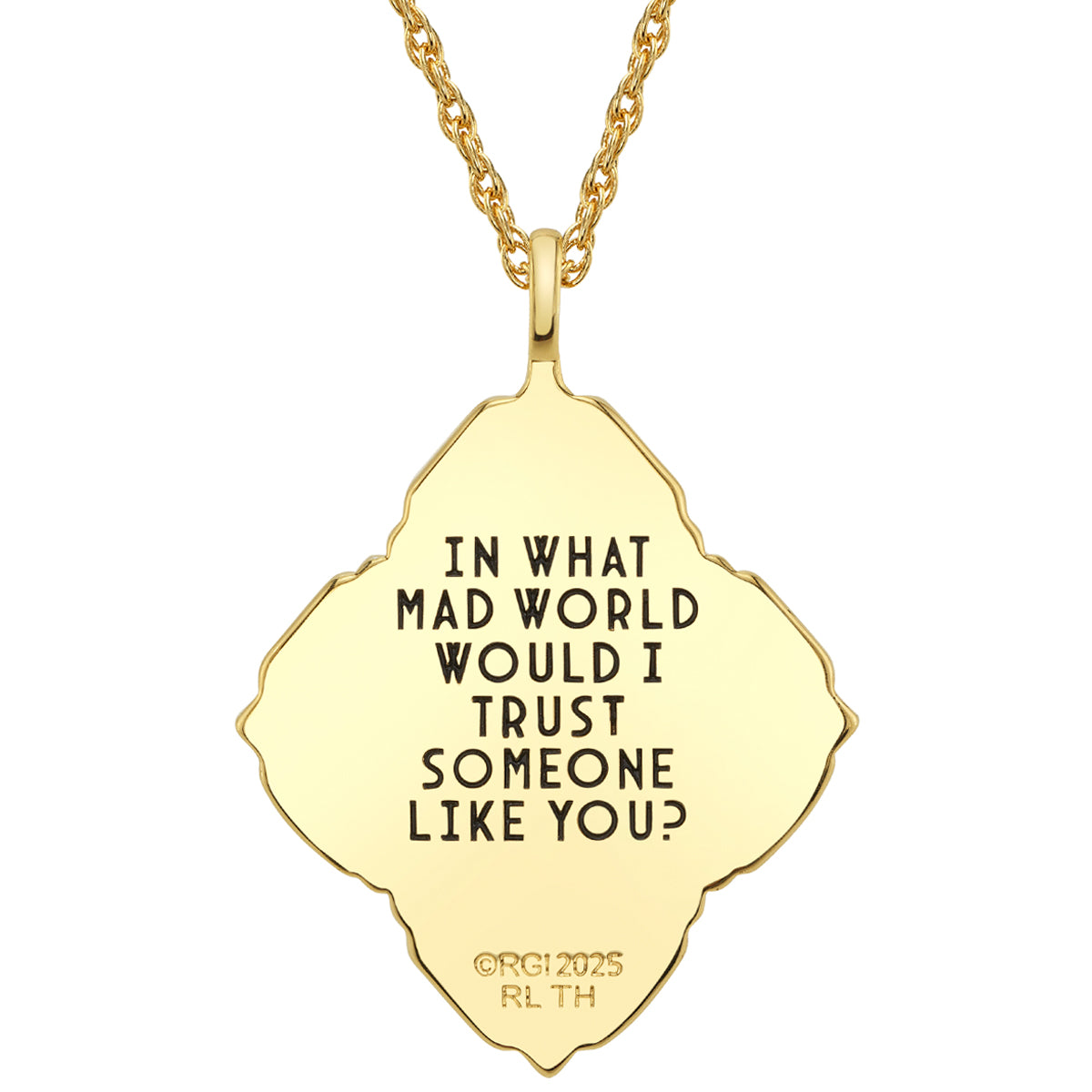 The reverse side is smooth and mirror-polished, engraved with the poignant quote that captures their shared vulnerability: “In what mad world would I trust someone like you?” The pendant hangs from a long, adjustable 14K yellow gold plated brass rope chain, complete with a signature tag – a tribute to the tension, tenderness, and undeniable connection that define Caitlyn and Vi.