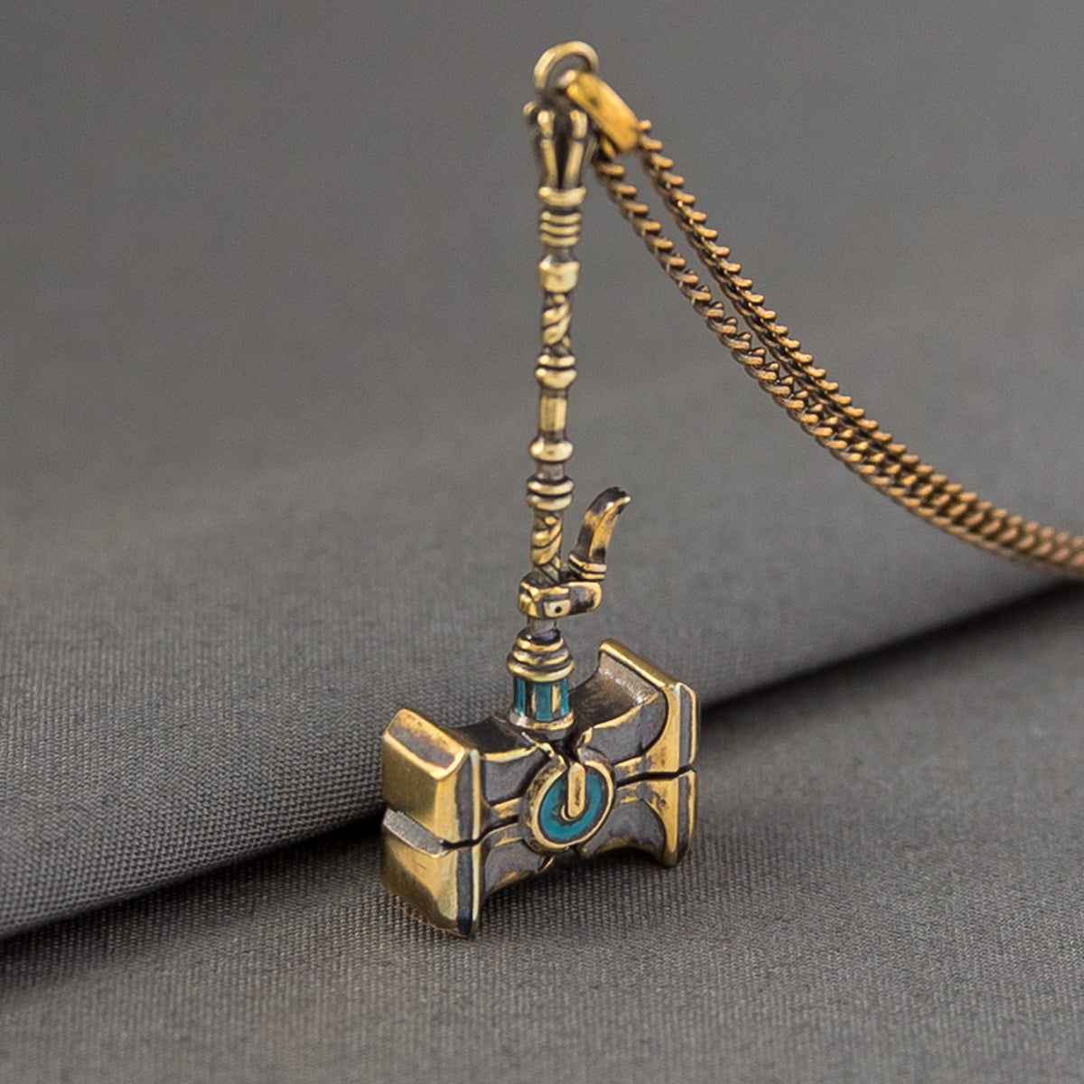 Handcrafted in nickel-free artisan brass with an antiqued finish, the pendant is intricately sculpted in three-dimensional detail to mirror the famed weapon that bridges science and power. UV-reactive enamel illuminates the hammer’s core, glowing bright blue under black light and in the dark, evoking the radiant pulse of Hextech energy. An articulated handle adds dynamic movement, reminiscent of how Jayce activates the weapon’s immense power. The pendant hangs from an adjustable antiqued brass curb chain, complete with a signature tag – a tribute to the genius, determination, and heart that drive Piltover’s Defender of Tomorrow.