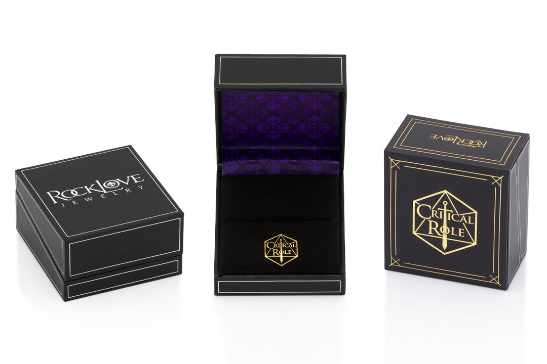 Thie Critical Role X RockLove jewelry arrives in a sleek black RockLove jewelry box that is wrapped by a black printed sleeve, accented with gold metallic Critical Role branding. Inside, the piece rests on a soft black flocked insert, silkscreened with additional Critical Role artwork