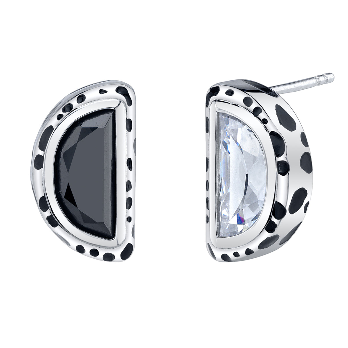 Handcrafted in solid sterling silver, the Cruella Chaos Earrings are a striking pair of studs that channel the villain’s love of graphic black-and-white style. Intentionally mismatched, each faceted half-moon shaped cubic zirconia crystal – one in brilliant white, the other in sleek black – gleams within a polished bezel. Hand-painted black enamel Dalmatian spots surround the stones and flow across the sides of the mirror-polished setting. Sterling silver posts are set at the top of each half-moon, creating a subtle yet daring retro silhouette that feels distinctly mod and unmistakably Cruella.