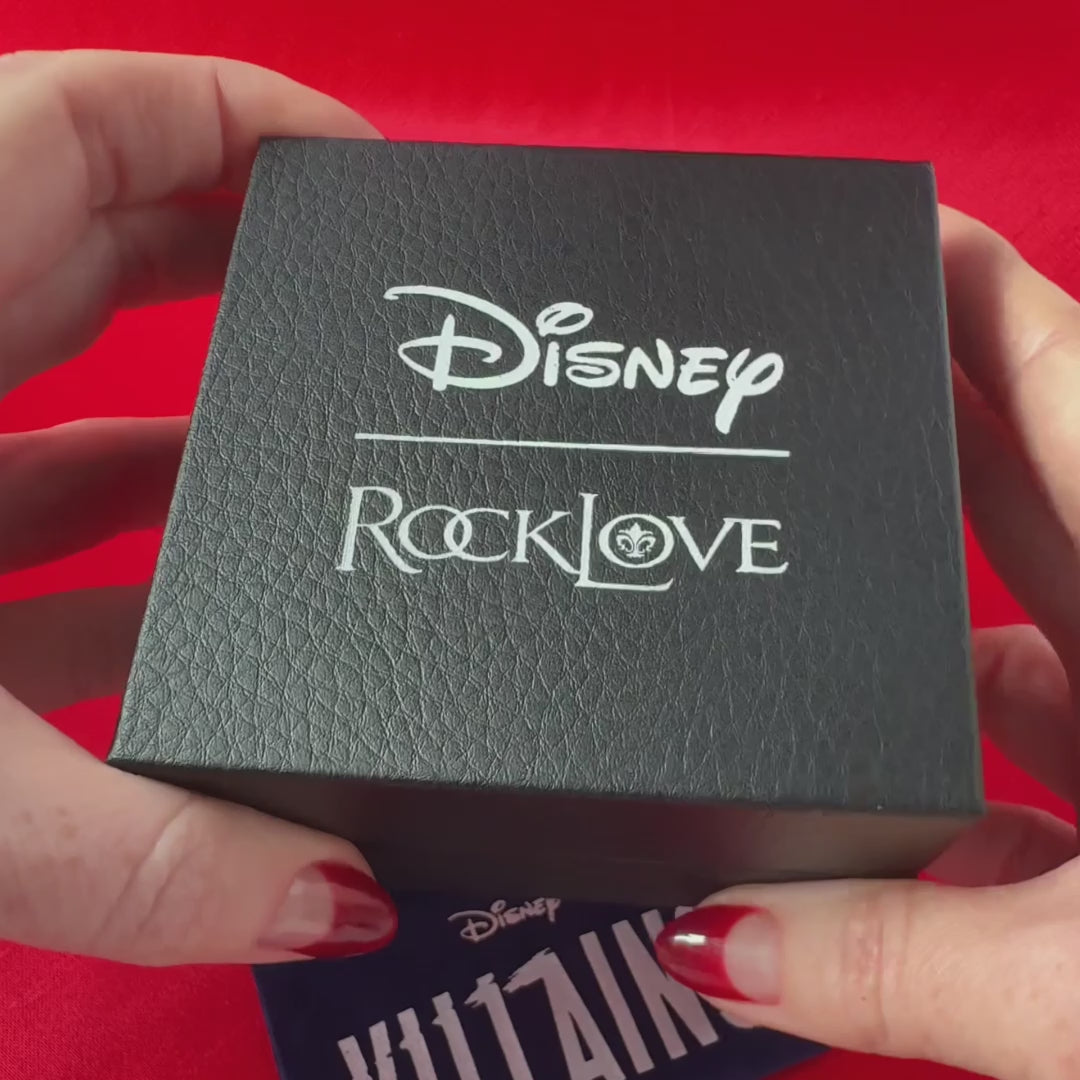 Every piece of Disney | RockLove Villains jewelry arrives in signature Boutique Box, including textured black leatherette exterior, with moody color-printed velvet-lined interior in Disney's signature villainous 'Static' design. Soft deep blue-purple flocking protects your RockLove jewelry and includes a branded luxury travel pouch.