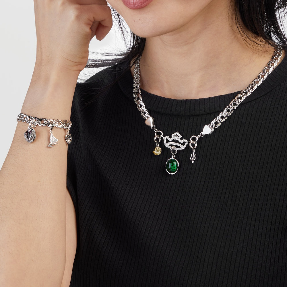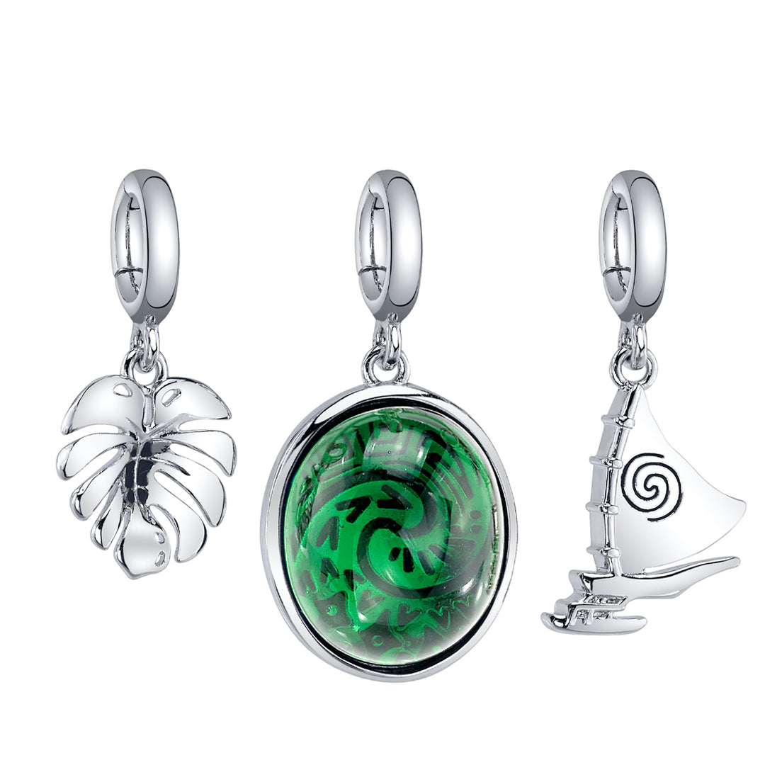 The Tiana Enhancer Set includes two twinkling stars representing Ray and Evangeline in sparkling white crystals, a brilliant emerald green pear-shaped crystal encircled by elegant swirls and leaves, and a dainty sculpted water lily blossom embracing a white pearl.