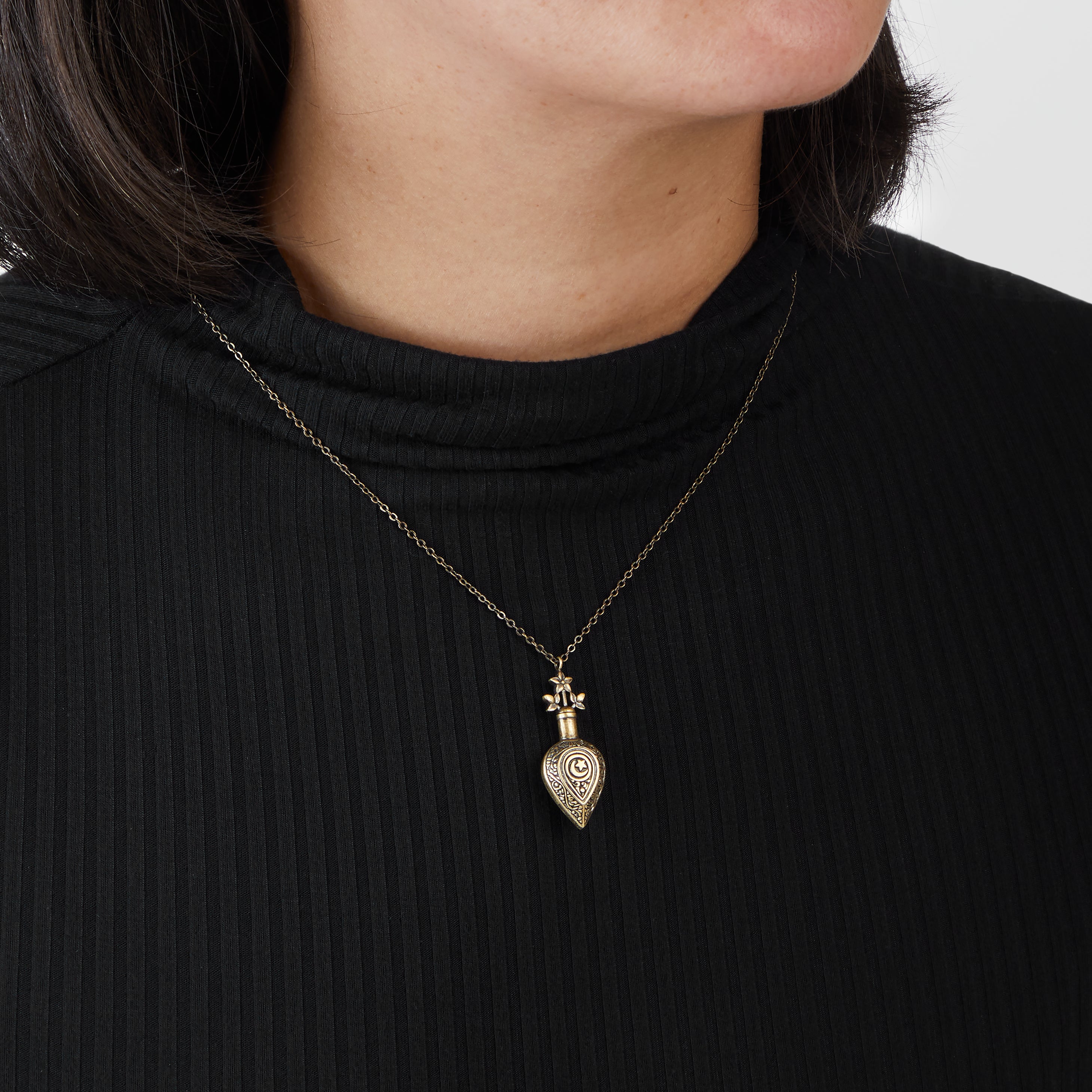 This striking pendant offers sleek style and versatility, sliding along a thick burnished brass 20-22 inch adjustable rope chain