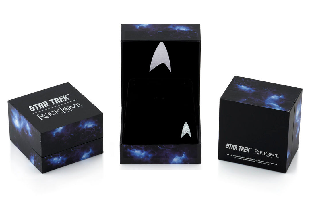 Each Star Trek X RockLove jewelry design arrives in a Collector's Box featuring silver metallic with vibrant blue galaxy print.