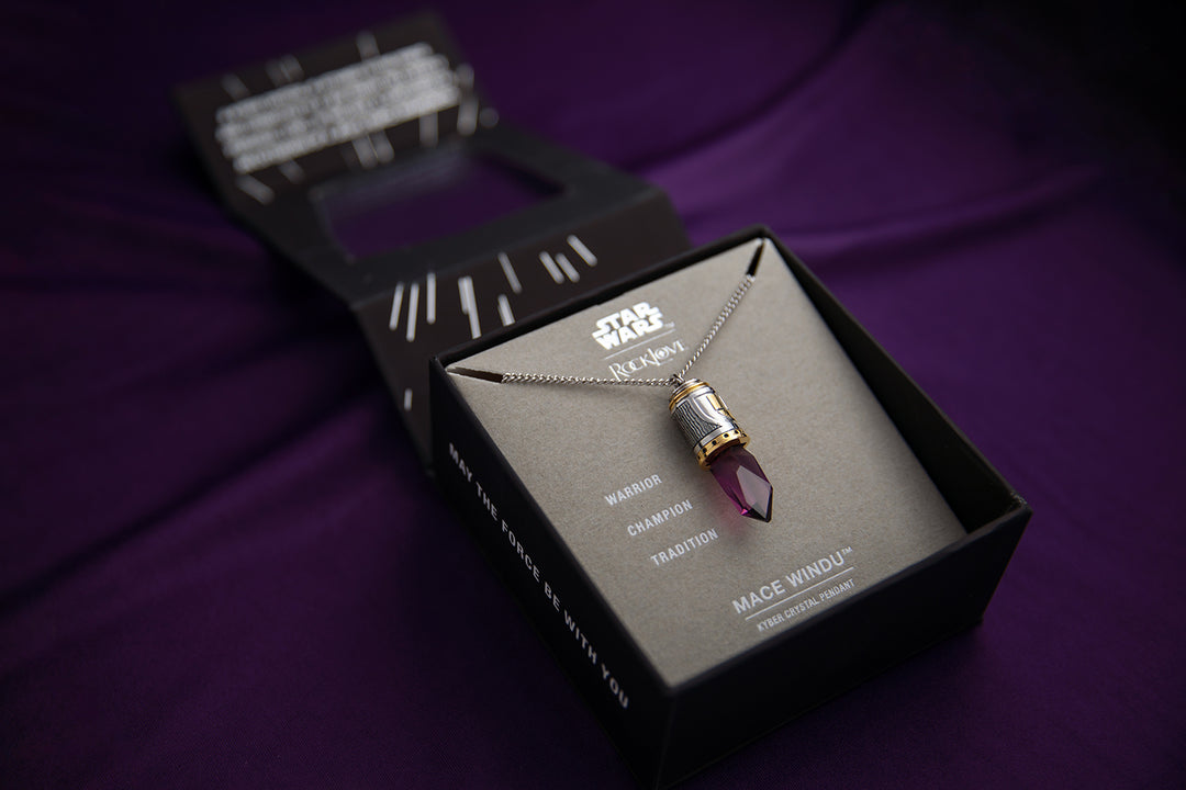 Every STAR WARS | RockLove Kyber Crystal design arrives in signature packaging with a magnetic lid that converts into its own angled display case. With silver metallic detailing, the flocked interior is customized to each character.