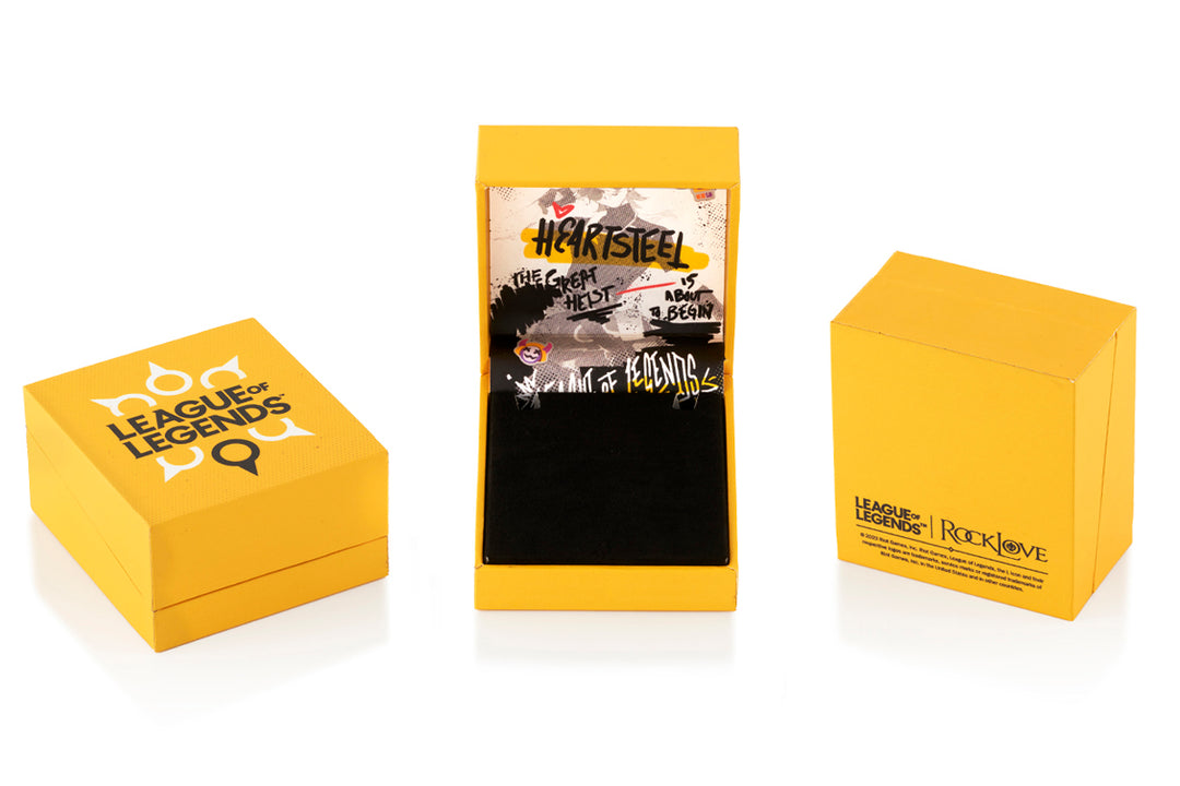 Each League of Legends X RockLove HEARTSTEEL jewelry design arrives in a signature Collector's Box, with vibrant art inside and out.