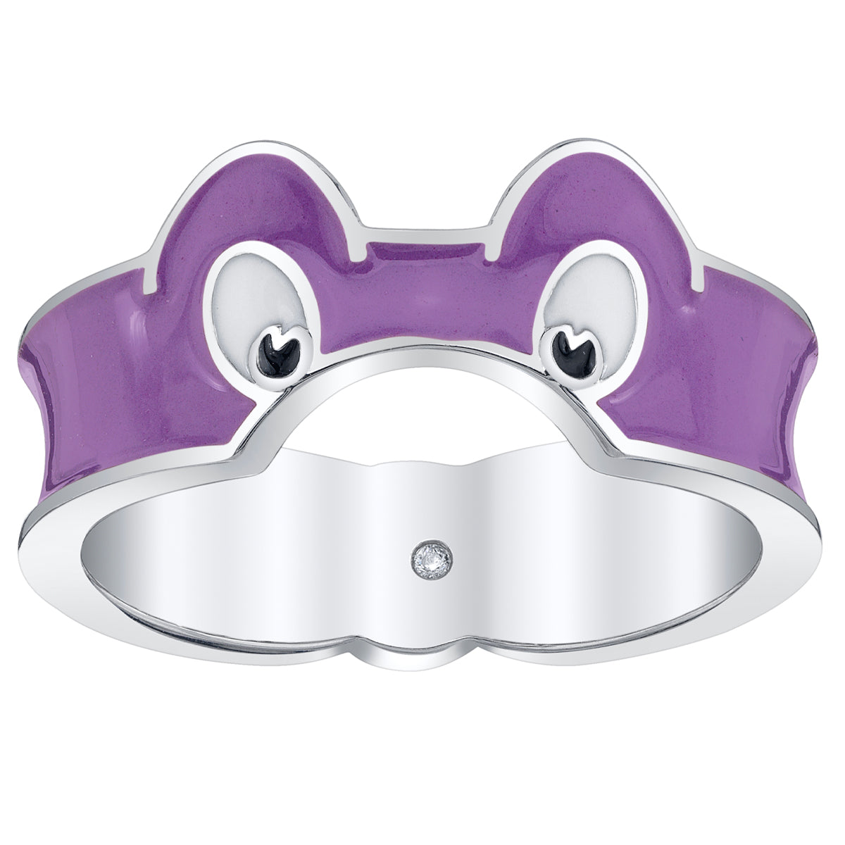 Handcrafted in polished silver plated nickel-free artisan brass, the Donatello Mask Ring is a must-have for fans of the tech-savvy turtle. The mask is sculpted with a playful expression and raised brows at the top of the finger. The full length of the band is coated in glossy enamel in signature purple, offering a sophisticated touch of Turtle Power. The sculpted mask ties continue on the underside, framing a round silver emblem etched with Donnie’s initial “D,” which personalizes the design and protects the underside of the band from everyday wear.