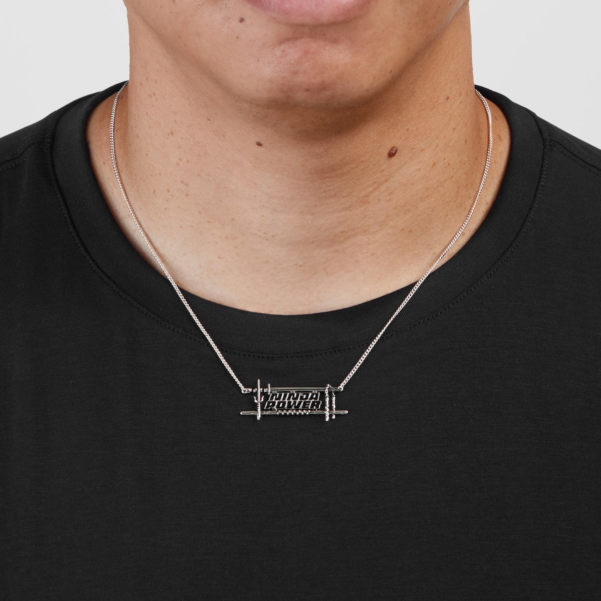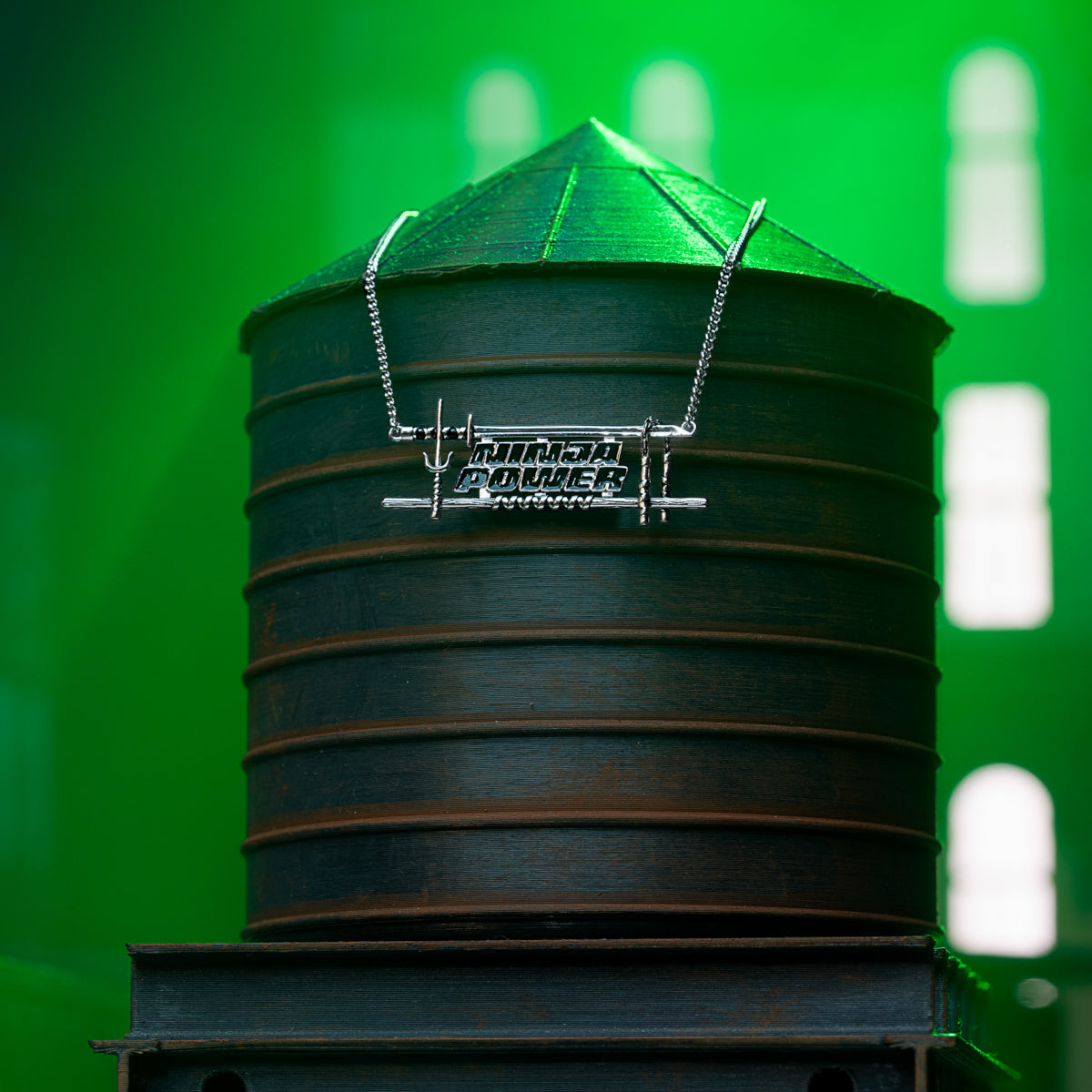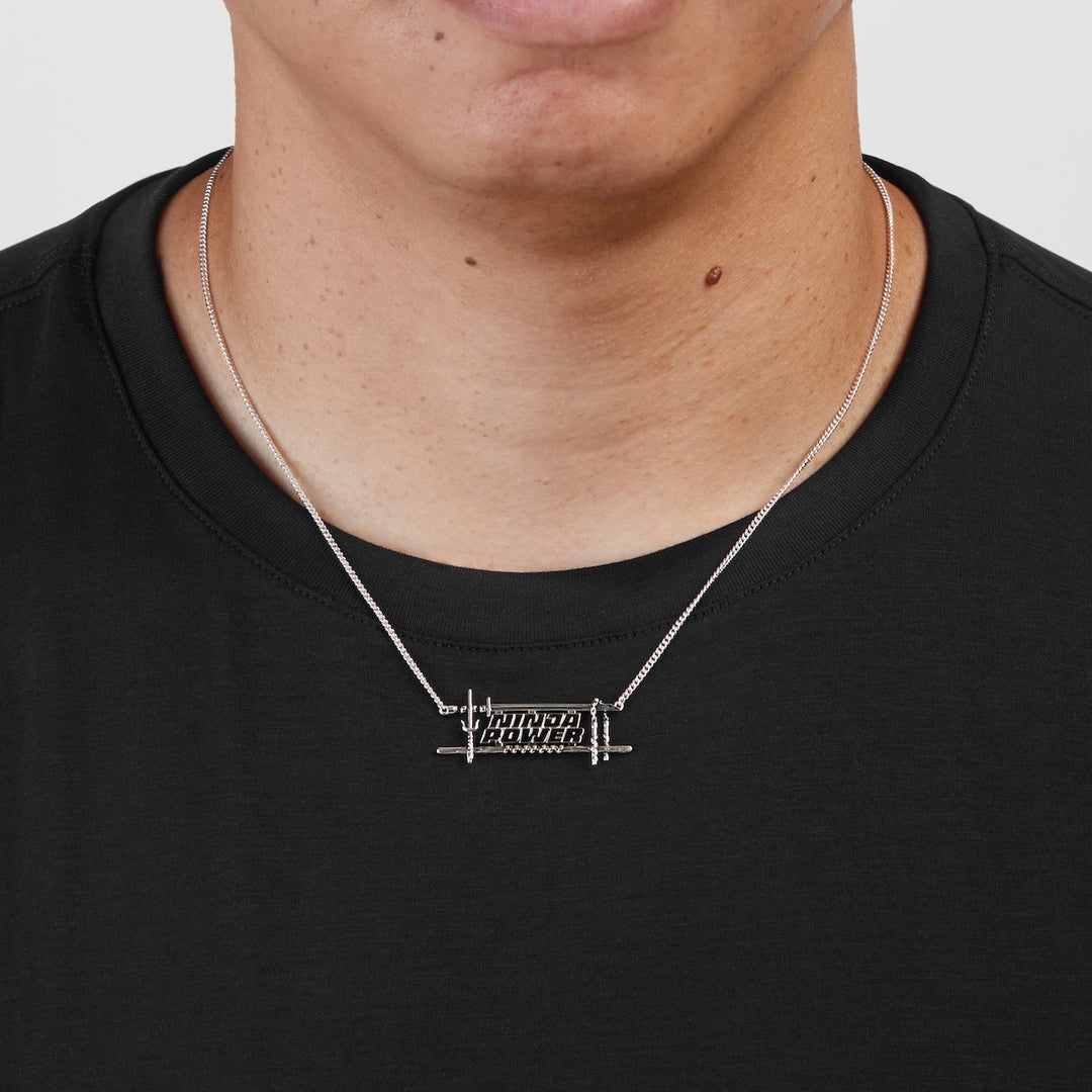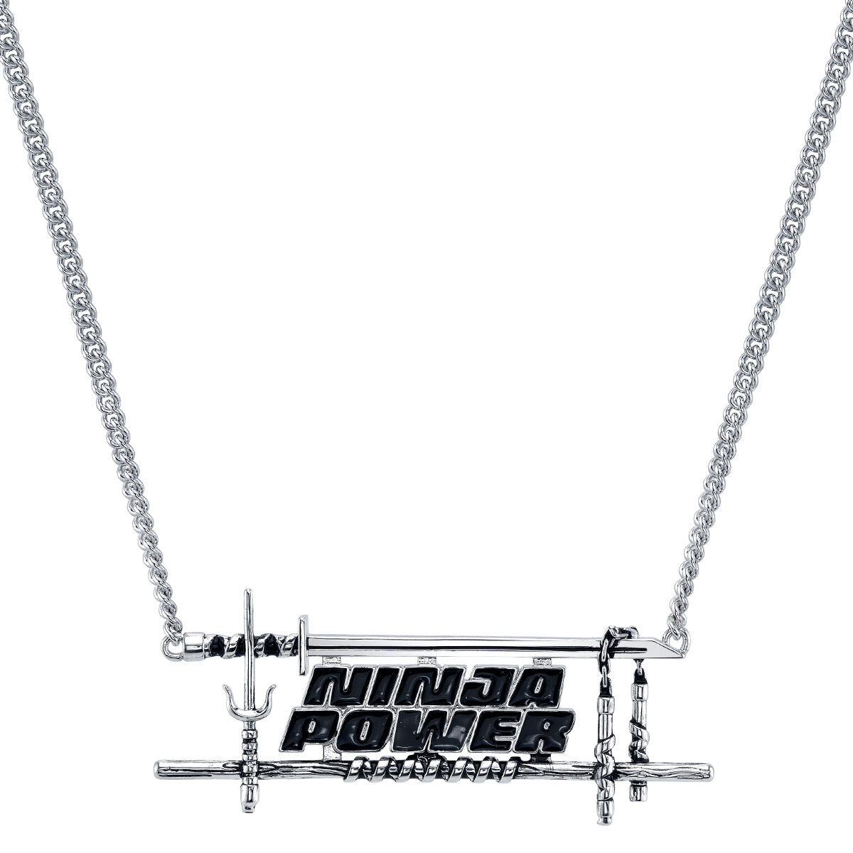 Handcrafted in silver-plated nickel-free artisan brass, the Ninja Power Necklace unites all four Turtle brothers’ weapons into one bold design. The words “Ninja Power” are sculpted in the style of a statement nameplate, each letter filled with glossy black enamel and framed by a polished silver border. Surrounding the lettering are the Turtles’ iconic weapons – Leonardo’s katana, Michelangelo’s nunchaku, Raphael’s sai, and Donatello’s bo staff – antiqued to enhance detail and positioned to create a balanced frame. Suspended between two lengths of adjustable curb chain, this wearable yet striking necklace is a must-have for fans who want to channel the power of all four heroes at once.