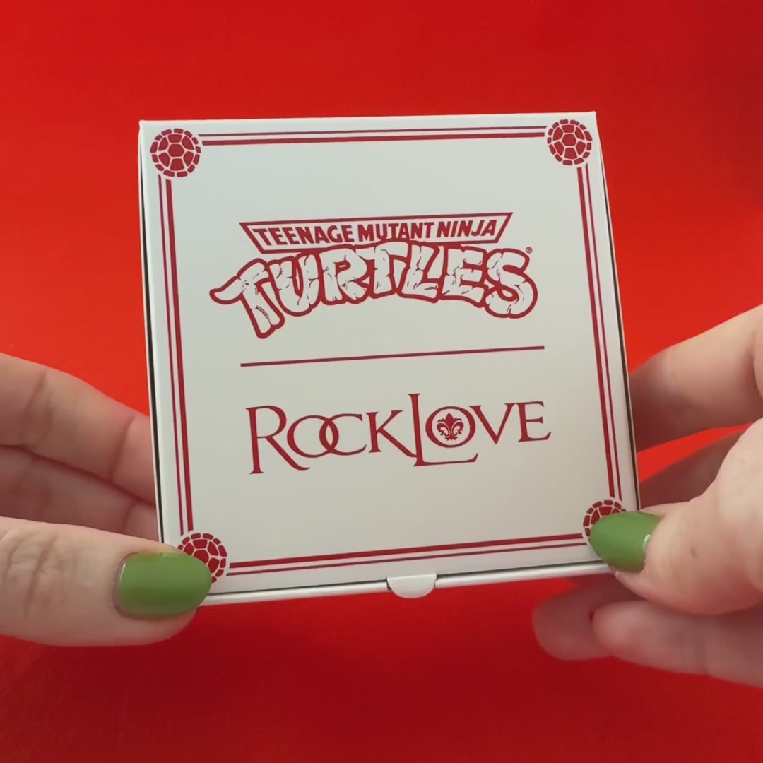 Each piece of Teenage Mutant Ninja Turtles X RockLove jewelry arrives in a custom Collector’s Pizza Box, designed to look like it came straight from your favorite New York pizzeria! Crafted from printed cardstock, the pizza box packaging features a crisp white exterior covered in bold red TMNT branding across every panel. Open the box to reveal character artwork on the interior lid and a classic red-and-white checkerboard bottom. Resting inside is a foam-and-cardstock pizza insert, printed to look like a mouthwatering pie,securing your jewelry in place for the ultimate collectible presentation.