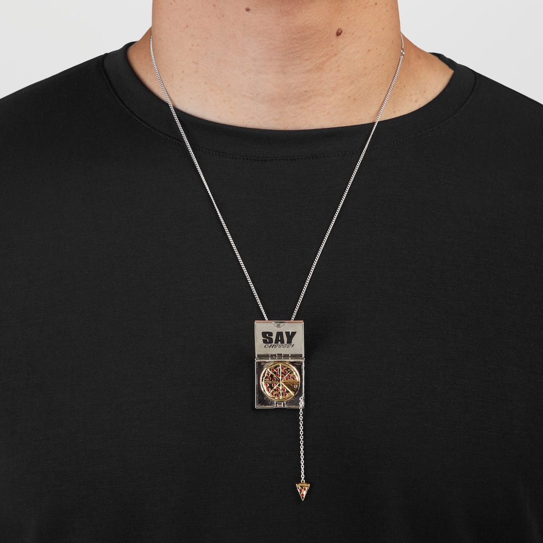 Handcrafted in polished silver plated nickel-free artisan brass, the Pizza Box Necklace is the ultimate collectible for fans who know that every mission deserves a pizza party. The exterior of the three-dimensional pizza box gleams in polished silver, etched with nostalgic 90’s-style cartoon artwork of all four Turtles, plus the phrases “Turtles Pizza” and “Taking On Pieces And Bad Guys Since 1984!” in bold lettering. The box hinges open like a locket to reveal “Say Cheese!” engraved on the inner lid, while the bottom cradles a fully sculpted pizza pie plated in warm, polished 14K yellow gold. The pie is topped with two dozen glittering red cubic zirconia “pepperoni” crystals. One slice, attached by a short chain, can be removed and re-secured in place with a hidden magnet – a playful interactive detail! Suspended from an adjustable curb chain, the box is intended to be worn closed… then reveal its secret snack whenever it’s pizza time!