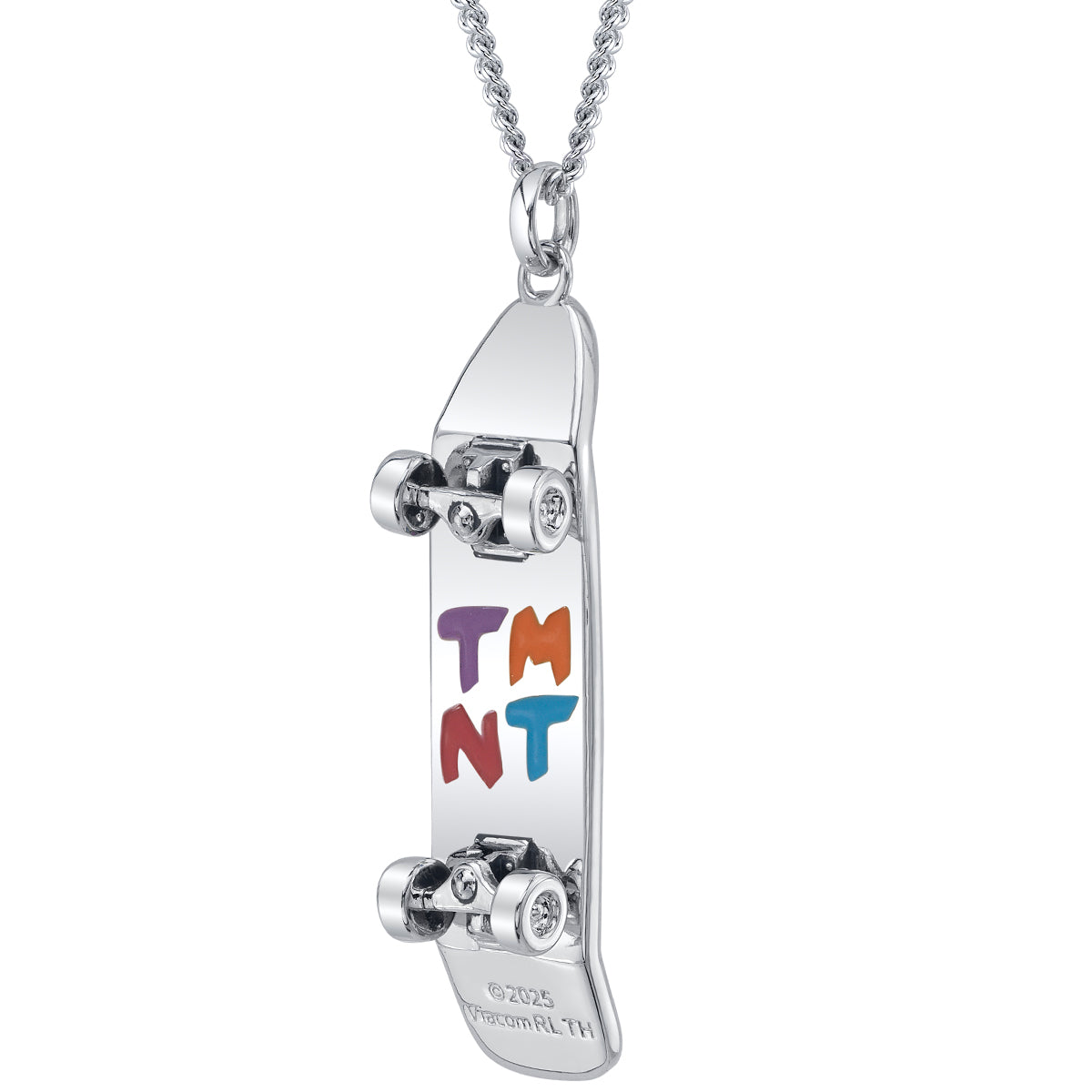Handcrafted in polished silver plated nickel-free artisan brass, the Skateboard Necklace is a kinetic tribute to 90’s street culture and Turtle style. The pendant is fully sculpted with detailed trucks and wheels, darkened with blackened accents for extra contrast. The top of the silver deck is etched with “Turtle Power!” in bold turtle-shell texture, darkened and layered with glossy transparent green enamel for a vibrant finish. Flip it over to reveal the underside, where “TMNT” is spelled in graffiti-inspired lettering, each letter filled with the brothers’ signature colors of purple, orange, red, and blue enamel. The wheels really roll – perfect for fidgeting, spinning, or even doing fingerboard tricks (a nostalgic nod for every 90’s kid). Wear it deck-up or deck-down on the adjustable curb chain for a look that’s as playful as it is versatile.