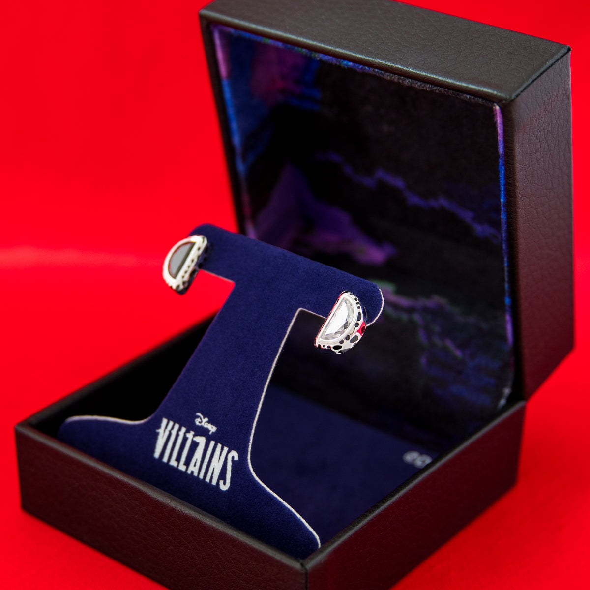Handcrafted in solid sterling silver, the Cruella Chaos Earrings are a striking pair of studs that channel the villain’s love of graphic black-and-white style. Intentionally mismatched, each faceted half-moon shaped cubic zirconia crystal – one in brilliant white, the other in sleek black – gleams within a polished bezel. Hand-painted black enamel Dalmatian spots surround the stones and flow across the sides of the mirror-polished setting. Sterling silver posts are set at the top of each half-moon, creating a subtle yet daring retro silhouette that feels distinctly mod and unmistakably Cruella.