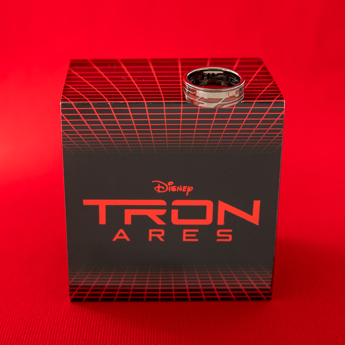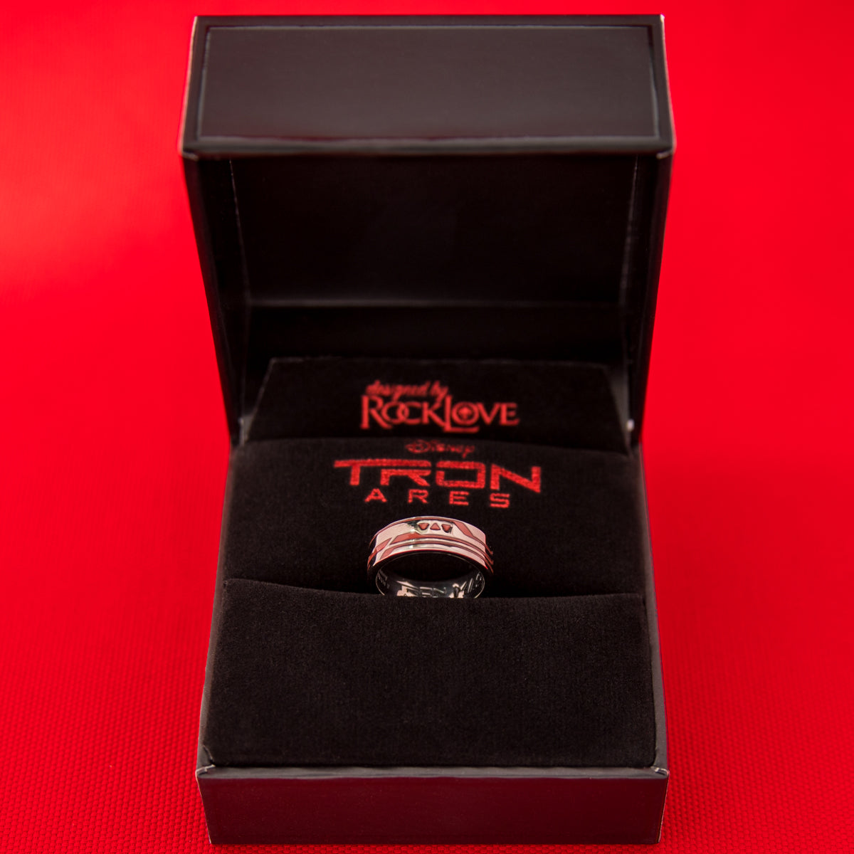 Every piece of Disney | RockLove TRON: ARES jewelry arrives in a signature Collector’s Box. The sleek black RockLove box is encased in a printed sleeve, wrapped in red grid geometry and branding. Inside, soft black flocking protects your jewelry, while metallic red foil logos add a striking finishing touch.