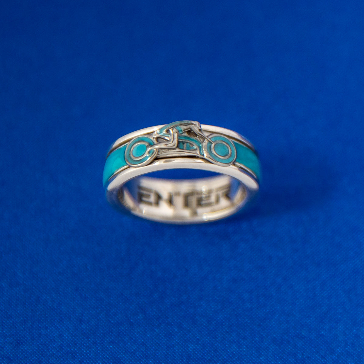 Handcrafted in solid nickel-free sterling silver, the Lightcycle Spinner Ring is a unisex kinetic statement piece inspired by the legendary lightcycle race. A sculpted black ruthenium plated lightcycle and silver track spin together as an interior band, letting you relive the thrill of the Grid with every turn. Inlaid with hand-painted UV-reactive enamel, the design glows bright blue under black light and in the dark, mirroring the lightcycle’s blazing trail. Hidden inside the band, the phrase “Enter the Grid” is engraved in the classic Tron font – a secret detail for true fans. Smooth and comfortable, this dynamic ring fuses Tron’s sleek high-tech aesthetic with everyday style.