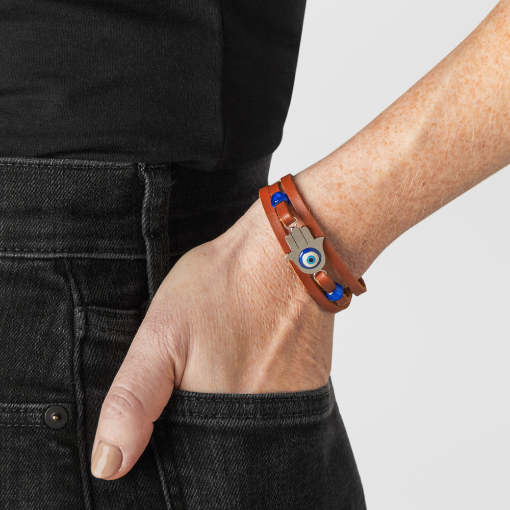 At its heart, a domed blue evil eye is rendered in premium hand-painted enamel, warding off misfortune. The silver hamsa charm is flanked by two faceted deep blue glass beads, adding a touch of depth and brilliance. Three strands of soft, supple genuine leather wrap the wrist in rugged elegance, with one strand subtly overlapped in the signature style of Ellie’s as seen on-screen bracelet. Designed for both durability and comfort, the bracelet features a 7-inch length with a 1-inch chain extender for a customizable fit.