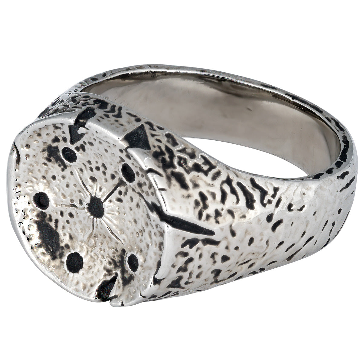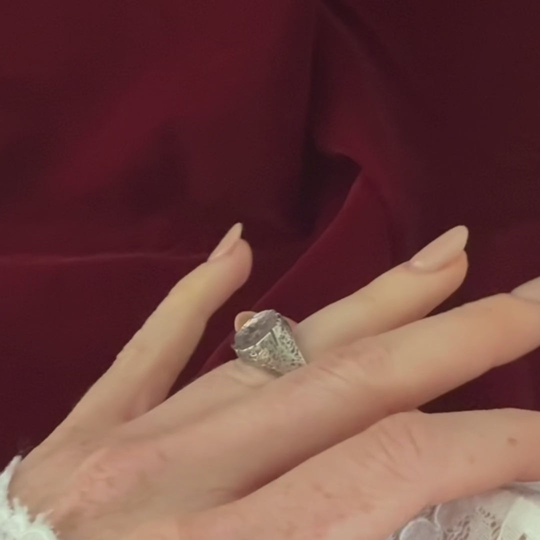 Handcrafted in nickel-free white bronze, this unisex ring features a timeless signet silhouette representing the High Seat of the Council of Le Bail. Each piece is individually distressed and antiqued for an authentic timeworn finish. With wear, the depth of the white bronze deepens, developing a soft, subtle warm yellow undertone that enhances its vintage character and gives every ring a uniquely aged look.