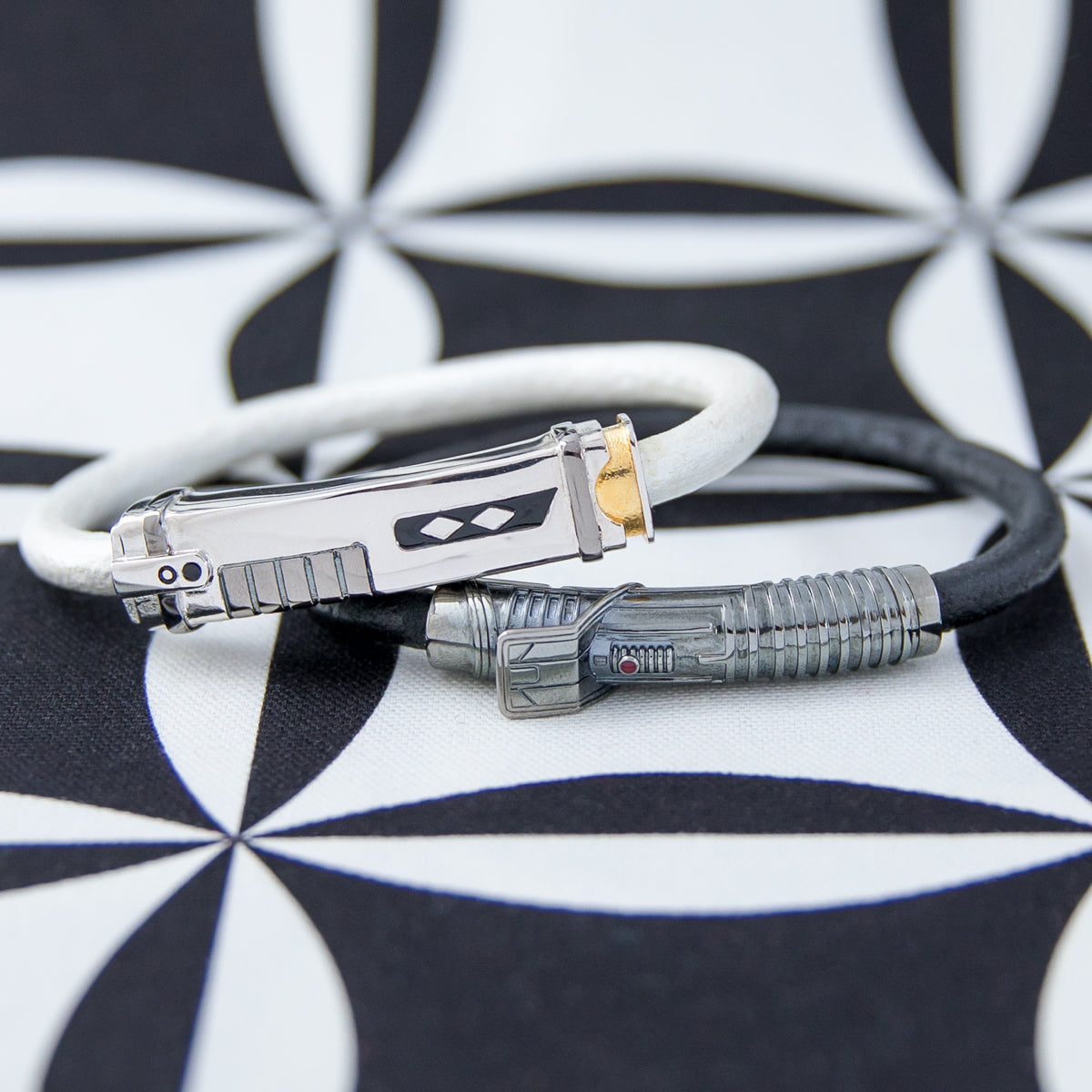 polished 14K yellow gold, black rhodium, and silver, with black enamel detailing, the AHSOKA TANO Leather Lightsaber Bracelet is a striking unisex statement piece for any STAR WARS fan. Rugged yet refined, Ahsoka’s iconic shoto LIGHTSABER hilt is solid and weighty in the hand, while remaining smooth and comfortable at the wrist for everyday wear. A custom-created 6mm genuine leather cord wraps securely around the wrist in Ahsoka’s signature white, referencing the luminous white hue of her dual lightsaber blades.