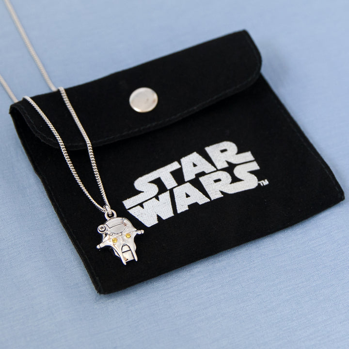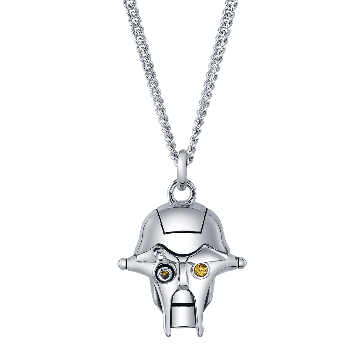 An ancient droid, but still quick of mind, PROFESSOR HUYANG oversaw the construction of Lightsabers in the JEDI ORDER for centuries. Handcrafted in sterling silver with antiqued details, the Huyang pendant features the droid’s stoic visage, with signature articulated ‘lens’ that rotates down over his left eye. Both eyes feature golden glittering cubic zirconia crystals. The pendant hangs from an adjustable sterling silver curb chain with signature tag.