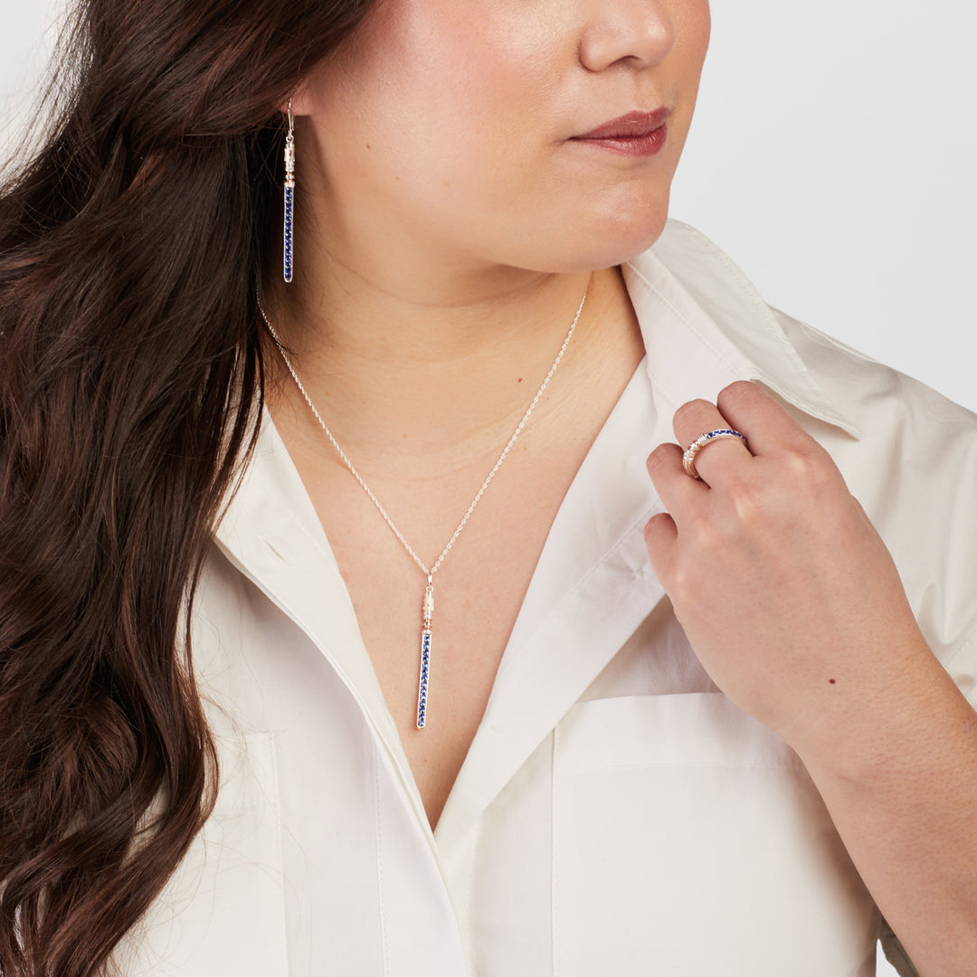 LEIA ORGANA dedicated her life to ending the EMPIRE’s tyrannical grasp across the galaxy. Her strength, determination, and fearlessness made her one of the greatest leaders and heroes of the REBEL ALLIANCE. Handcrafted in sterling silver, plated in polished rose gold, the necklace Lightsaber blade features glittering blue square-cut Austrian crystals. The pendant hangs from an adjustable sterling silver rope chain with signature tag and graceful extender weight.